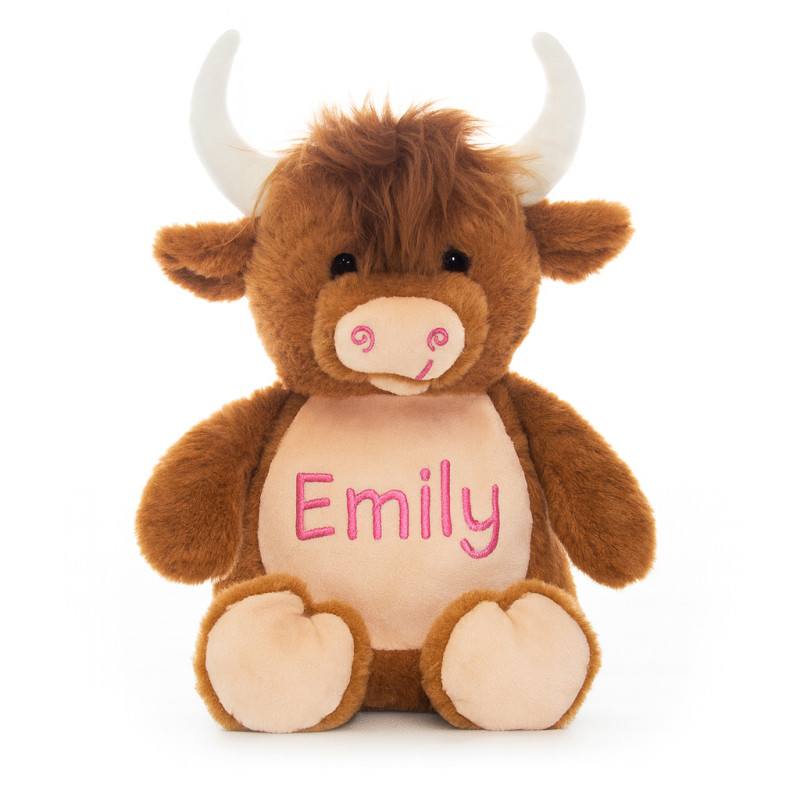 Personlig Højlands ko bamse fra Cubbies – blød, charmerende og med mulighed for broderet navn eller tekst på maven. Perfekt gaveidé til både små og store.