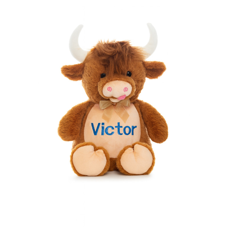 Den søde Højlands ko bamse fra Cubbies bliver helt personlig, når du får broderet navn eller tekst på maven. Bamsen har fine horn og detaljer, en lille sløjfe om halsen og et nuttet udtryk, der får alle til at smile. Den er blød, krammevenlig og perfekt som gave til både børn og voksne.