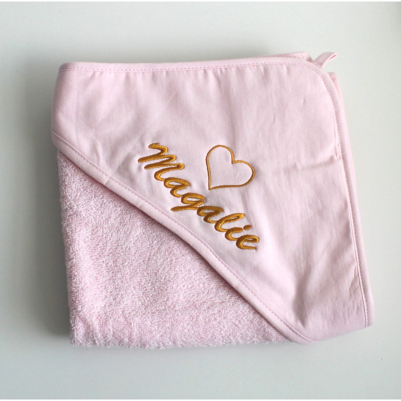Babyhåndklædet er lavet i 100% blød bomuld, som er skånsom mod den sarte babyhud og tørrer effektivt. Navnet broderes som udgangspunkt på hætten, men du kan også vælge en anden placering ved at skrive det i bemærkningsfeltet.