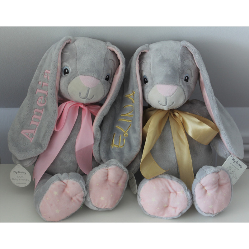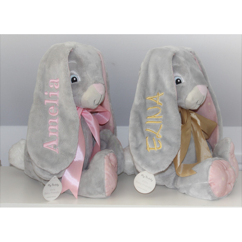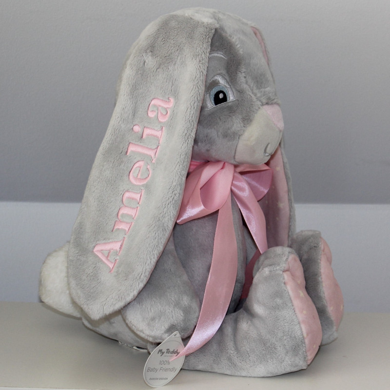 Dejlig blød kanin i grå med lyserøde detaljer. Den er stor og måler hele 32cm siddende og næsten 50 cm i total lægnde. Den hedder XL hos Myteddy. Der kan broderes i begge ører med navn og måske fødselsdato på.
