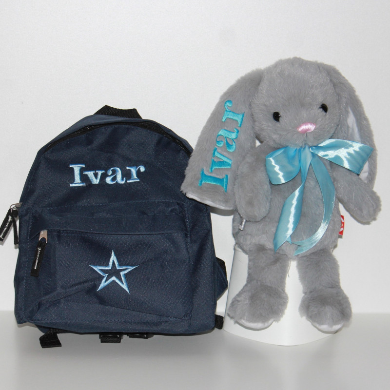 Sød grå kanin bamse med navn på maven og valgfri farve børnerygsæk med navn på.