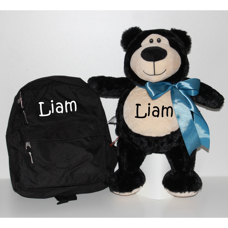 Skøn stor sort bamse med navn på maven og valgfri farve børnerygsæk med navn på.