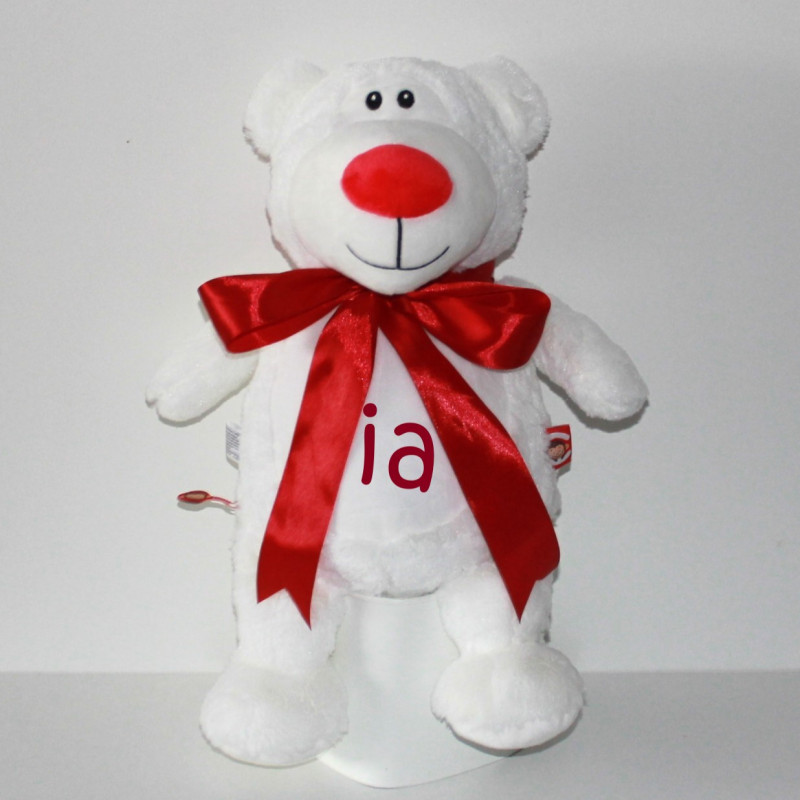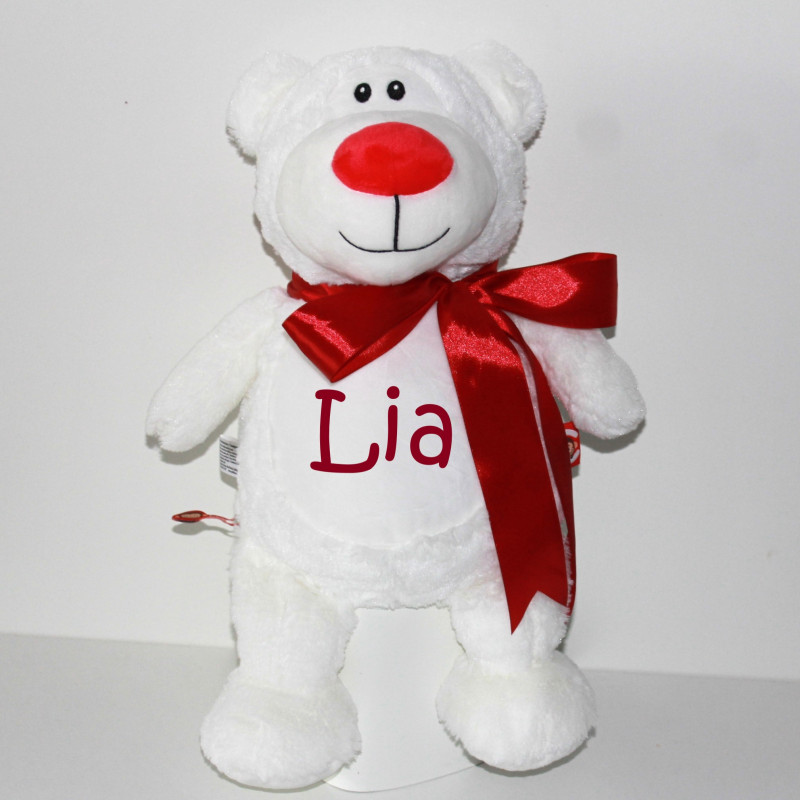 Fin hvid bamse med rød næse. Den bliver helt personlig med navn eller tekst på.