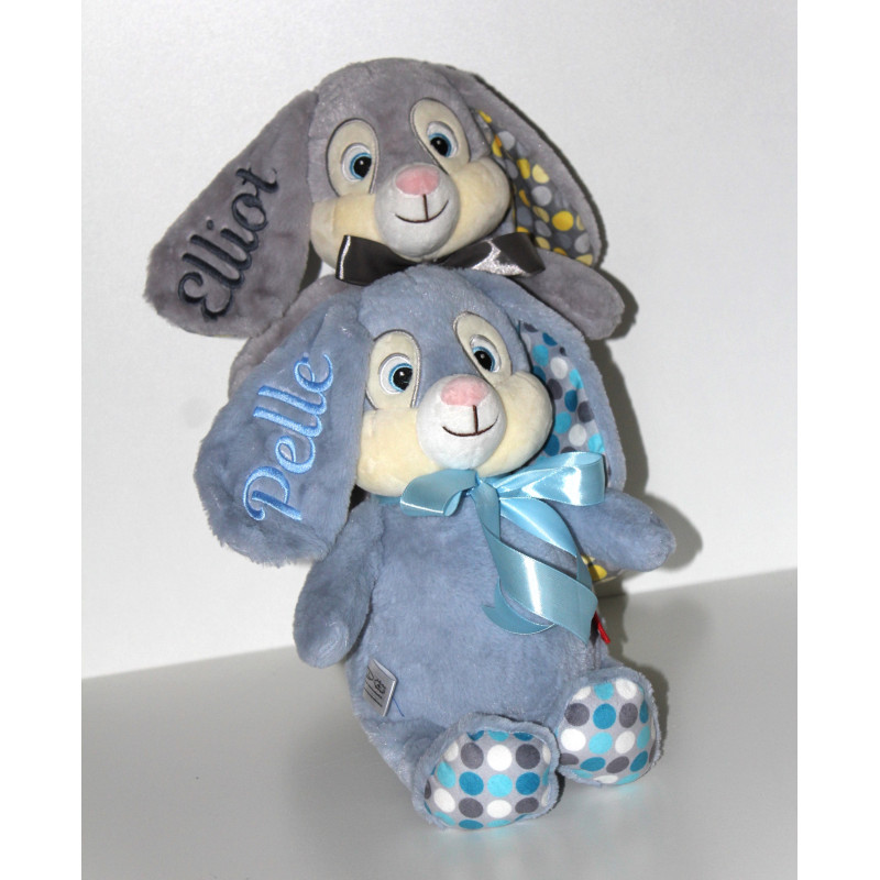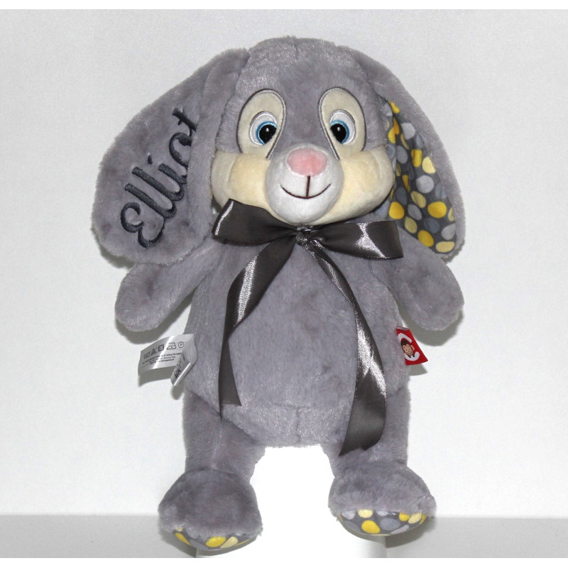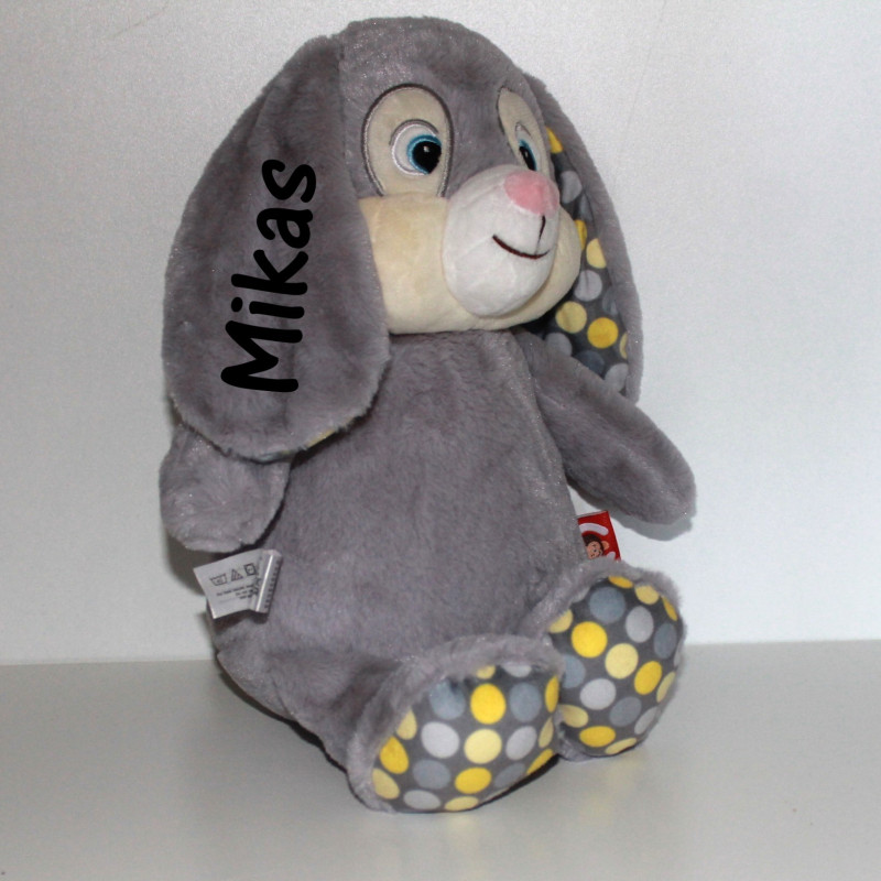 Denne charmerende grå kaninbamse fra Cubbies bliver helt personlig, når du får broderet navn eller tekst i de store ører. Bamsen er lavet i en smuk, neutral grå farve med prikkede detaljer i ørerne og under fødderne, som giver et elegant og tidløst udtryk.