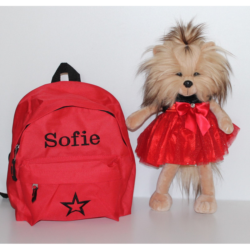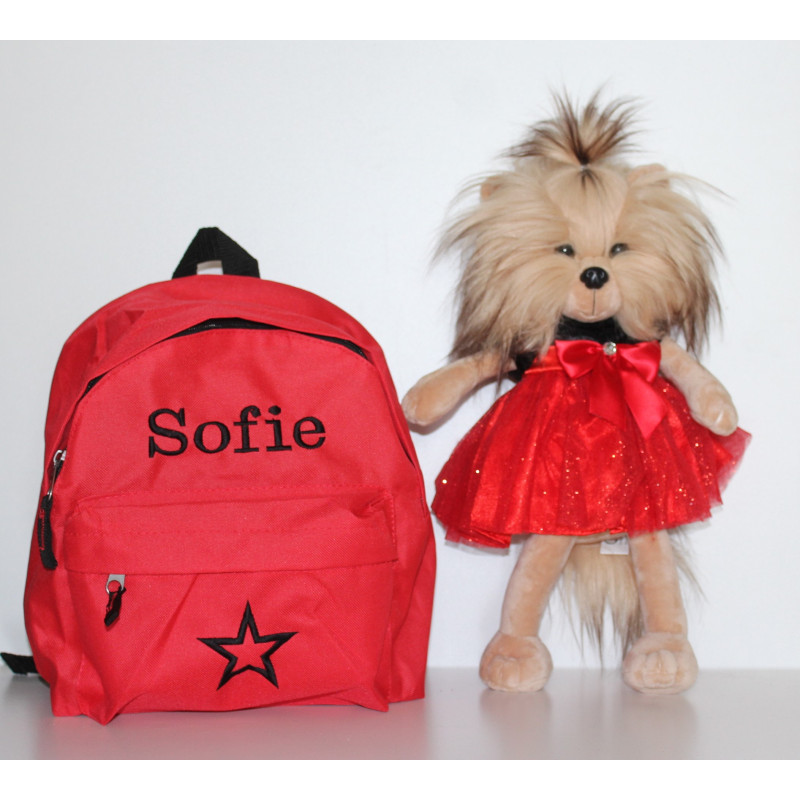 Skønneste sæt med Locky Doggy Fiesta hundebamse og rygsæk med navn på.
