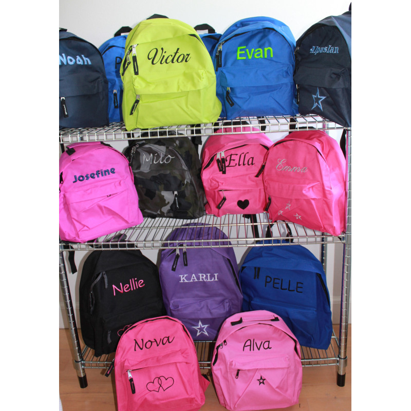 Der broderes personligt navn på børnerygsækken, den er i børnestørrelse ca. 30x25x12 cm. Du kan du frit vælge mellem taske farverne: Sort, lys Pink, Rød, Camoflage, Lyseblå, Mørkeblå, Limegrøn, Grå og blå.