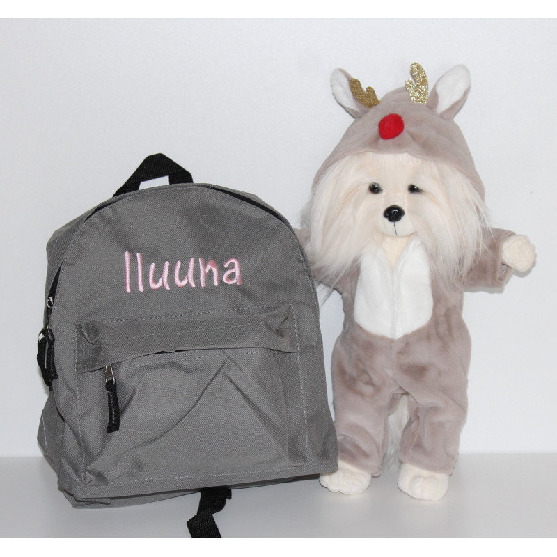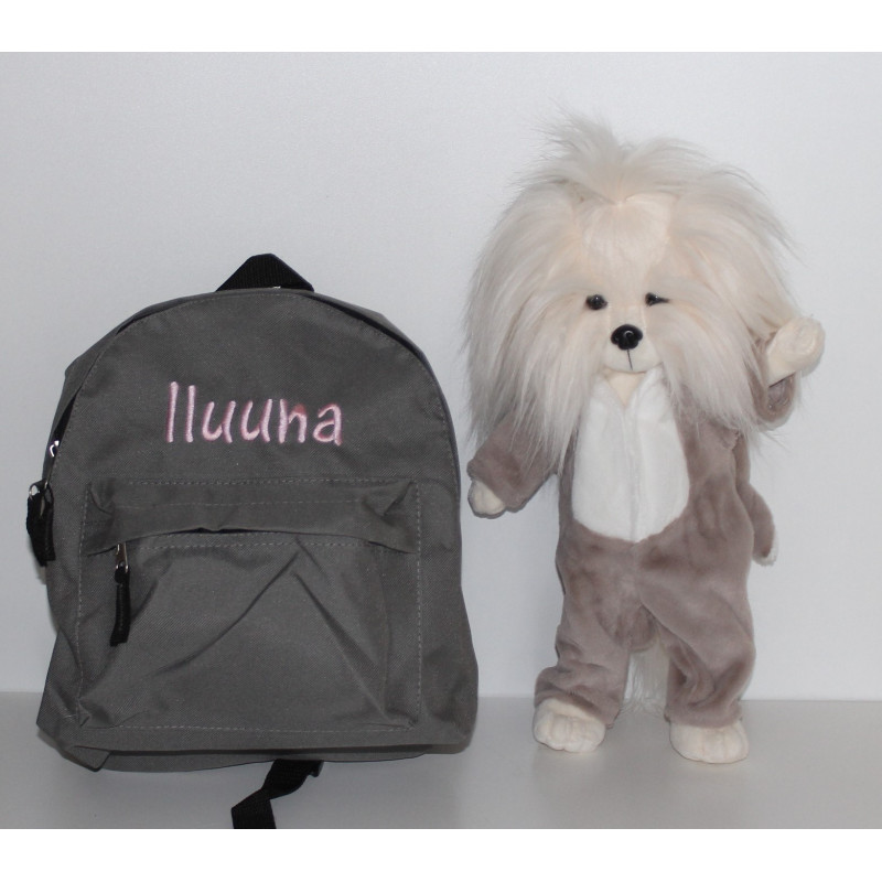 Skønneste sæt med Locky Doggy Mimi hundebamse og rygsæk med navn på.