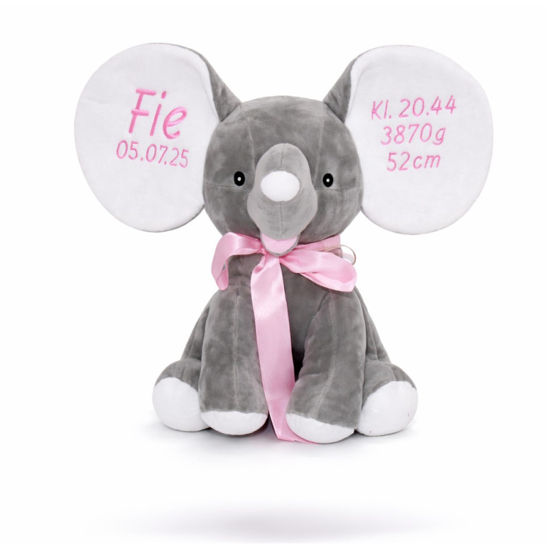 Den sødeste gaveidé til nyfødte og små børn – en stor, blød elefantbamse med navn broderet på de kæmpe store ører. Bamsen kan gøres helt personlig med navn, fødselsdato, vægt, længde og tidspunkt – en unik og mindeværdig gave, der varer hele livet.