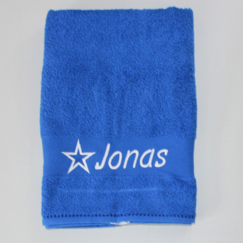 Lækkert blåt blødt håndklæde med broderet navn på.