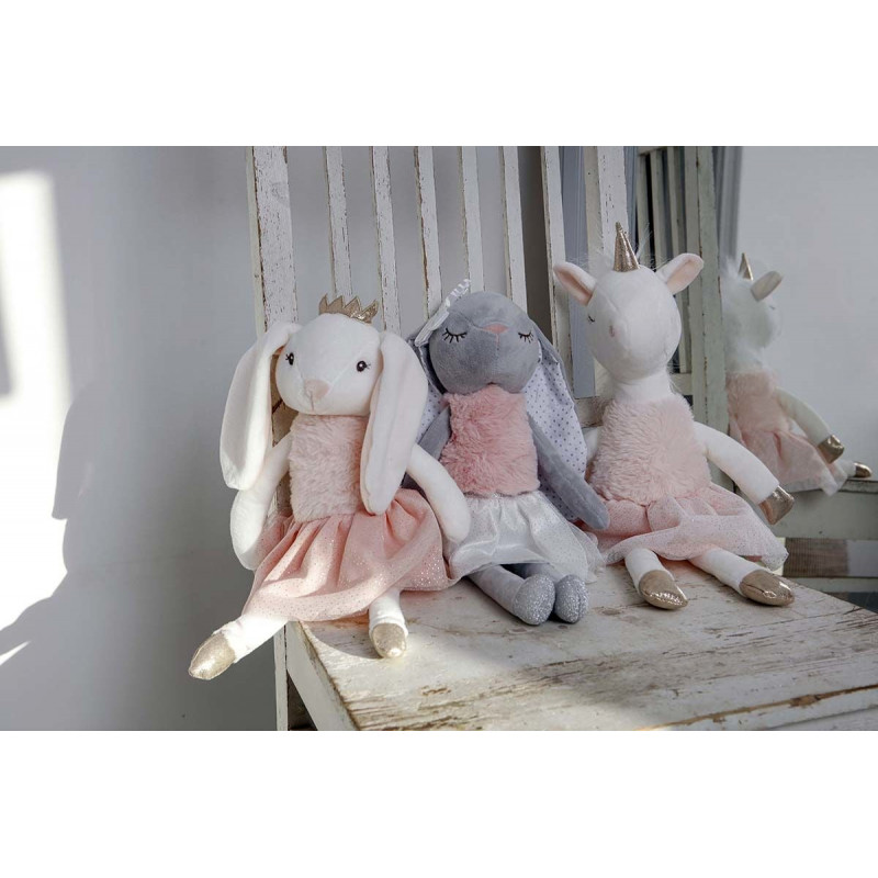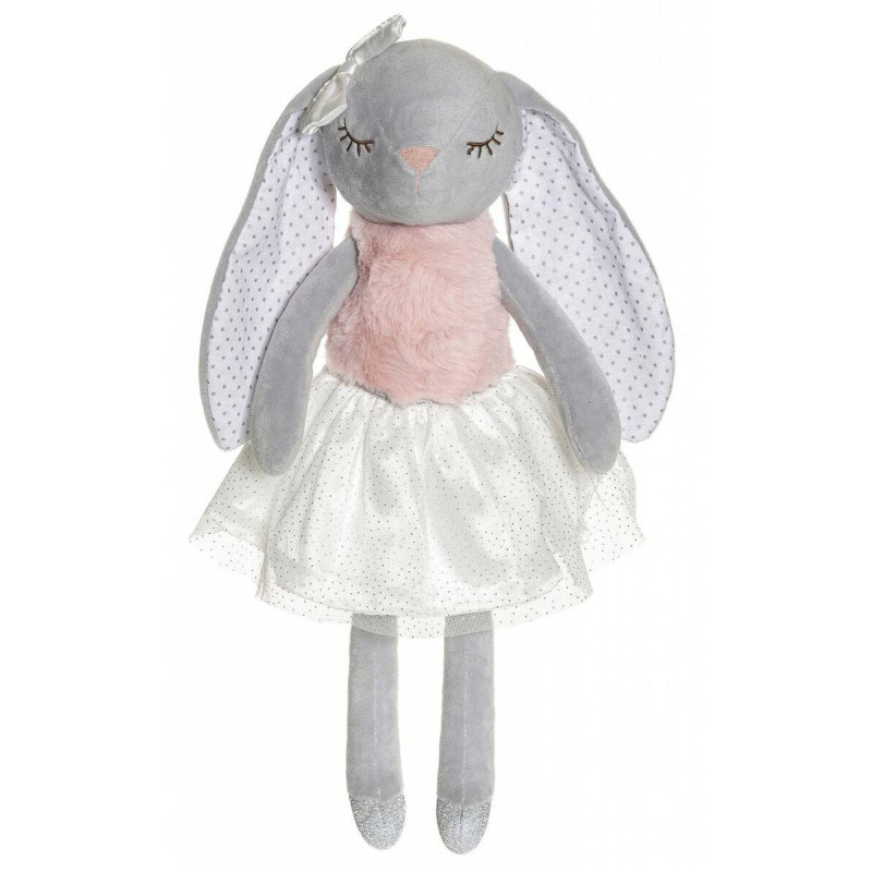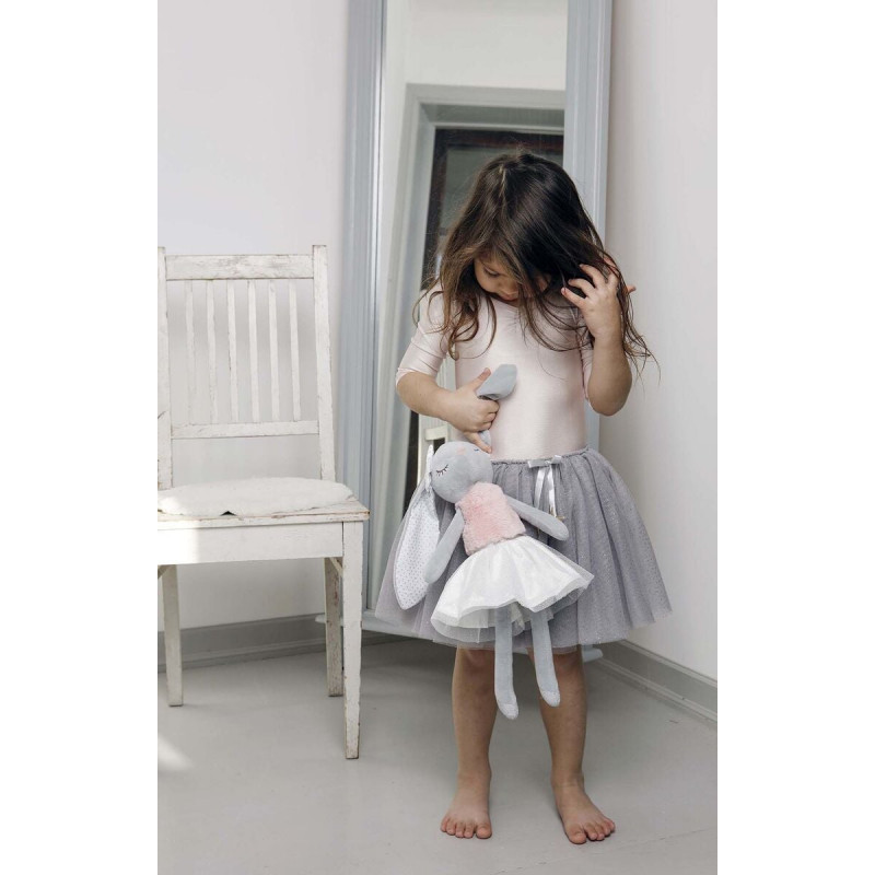 Den skønne kaninbamse måler 40cm og har fint hvidt og lyserødt ballet tøj på. De fine balletsko er i sølvglimmer. Bamsekaninen har en fin hvid sløjfe på øret.