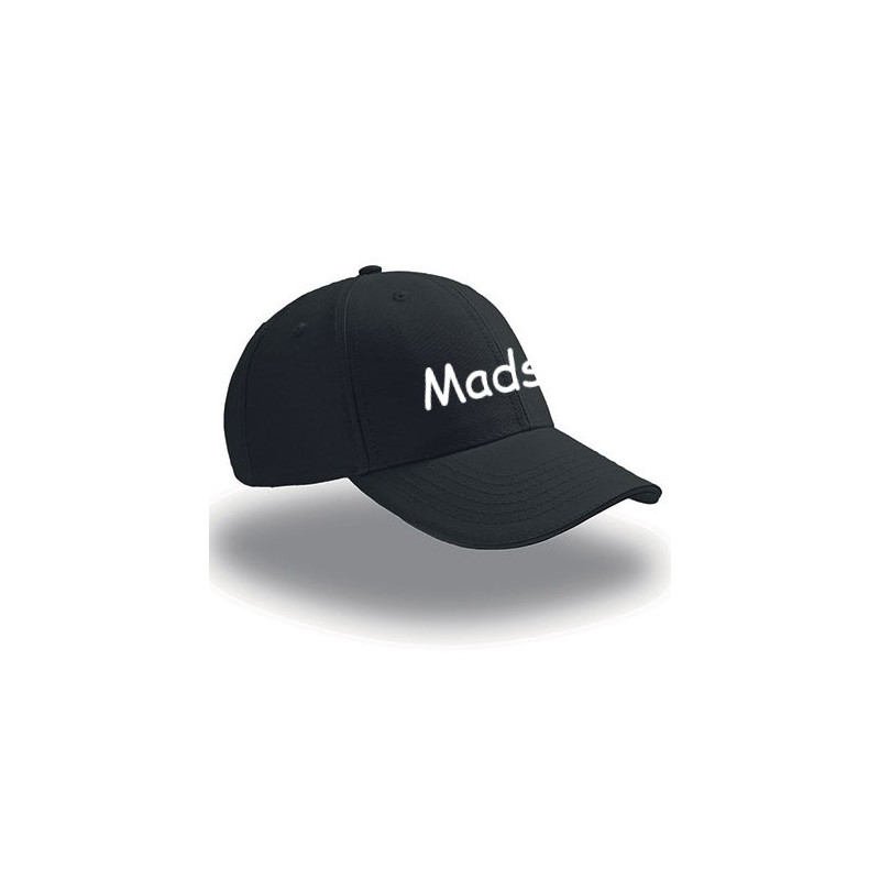 Personlig sort kasket i voksenstørrelse, med navn broderet på.