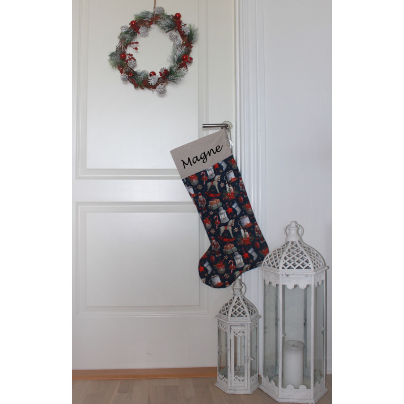 Fin stor mørkeblå julesok med nøddeknækker motiver og broderet navn på.