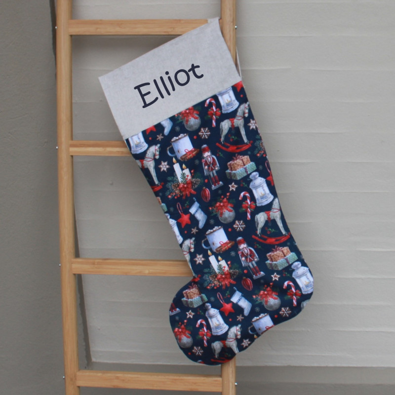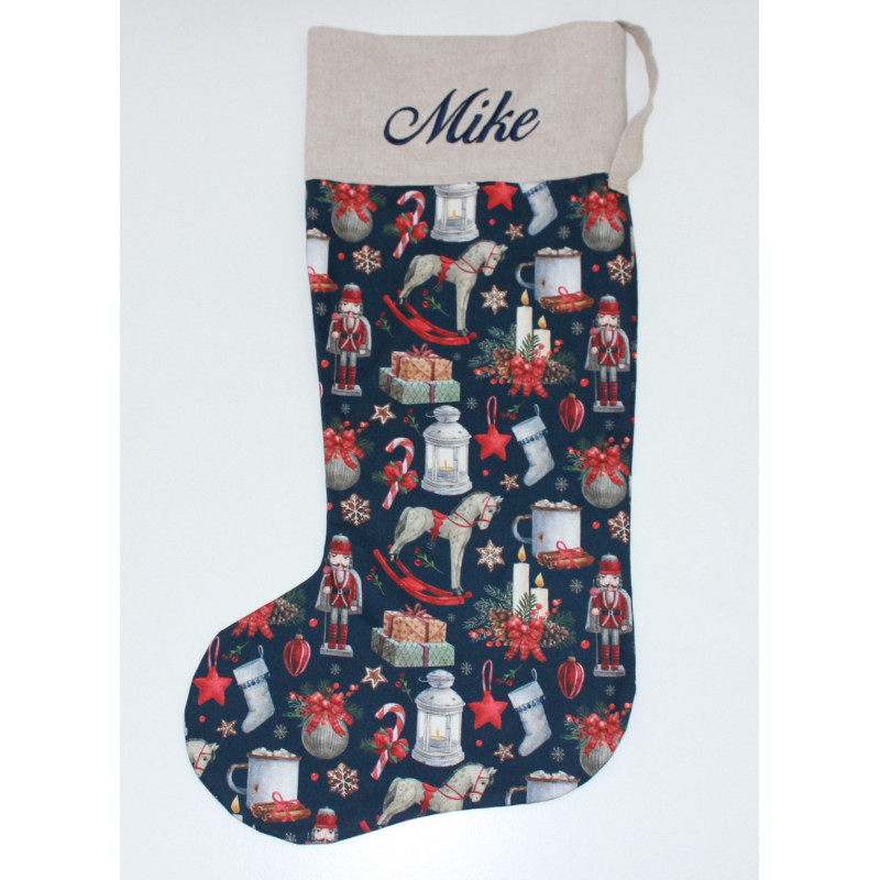 Fin stor mørkeblå julesok med flotte nøddeknækker motiver og broderet navn på. Den store julestrømpe har god plads til gaver og kan hænge klar til når Julemanden kommer forbi.