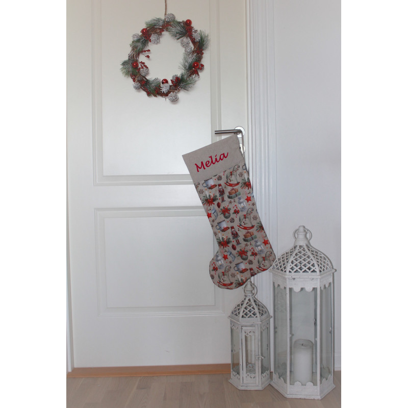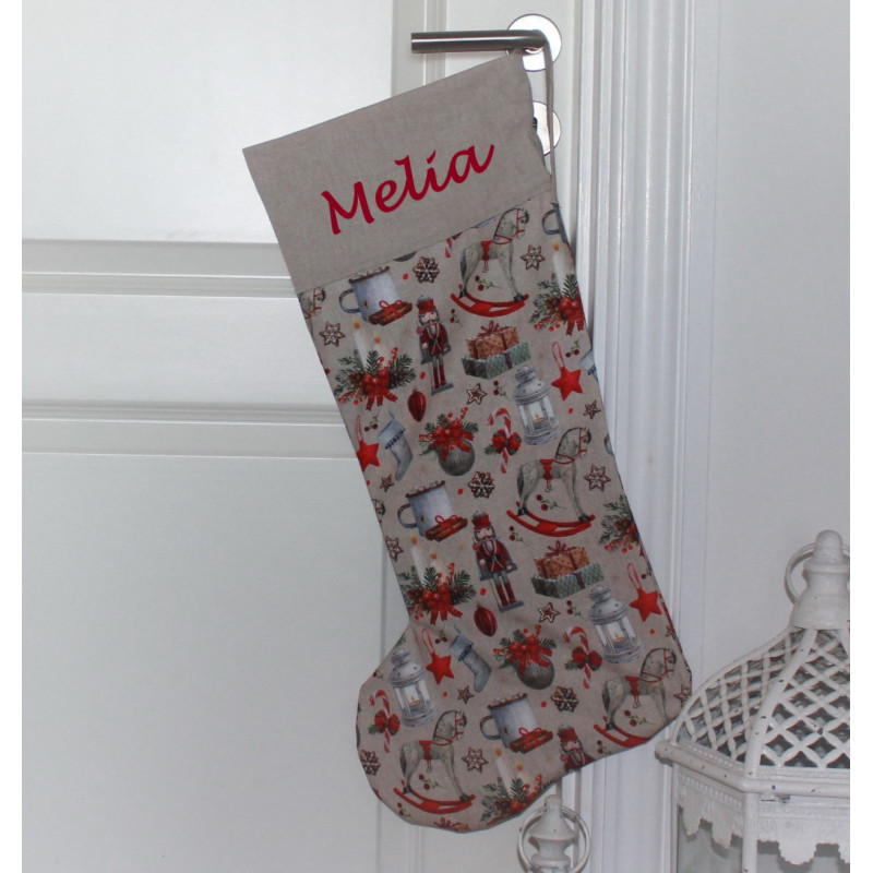 Fin stor lysebrun julesok med nøddeknækker motiver og broderet navn på.