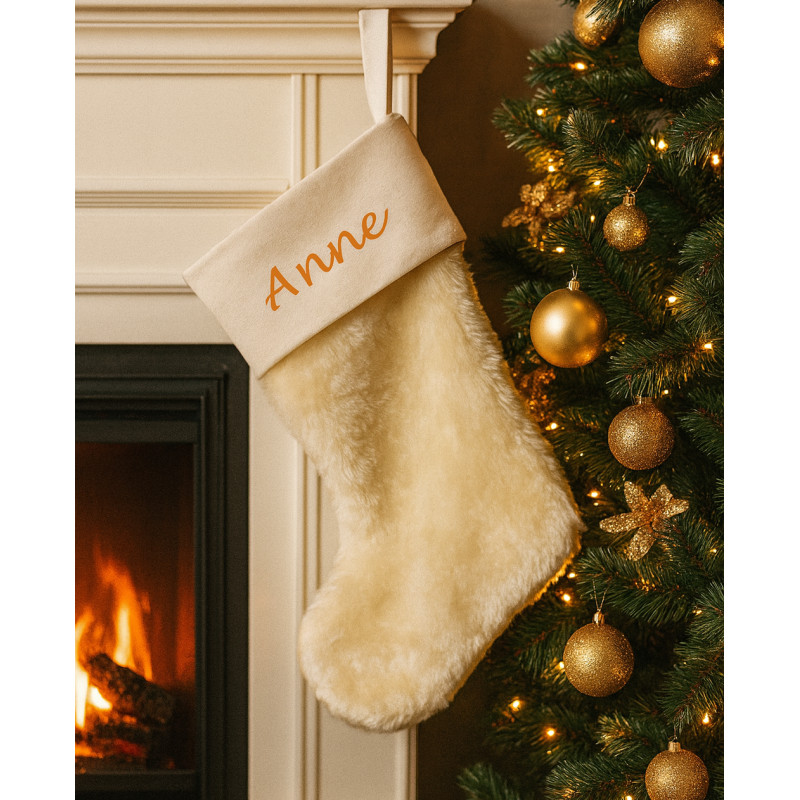 Fin julestrømpe i cremefarvet imiteret pels. Strømpen er lavet i langhåret pels med kant i naturfarvet hør.