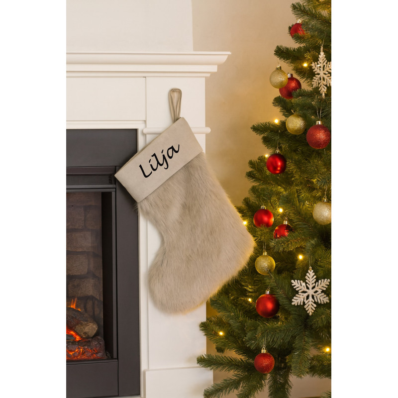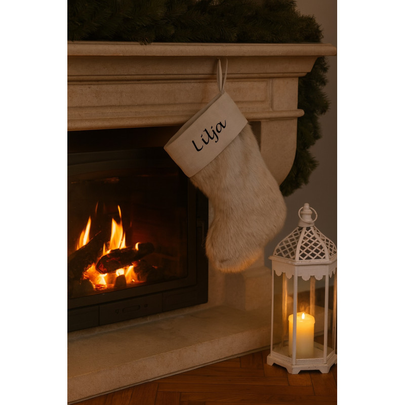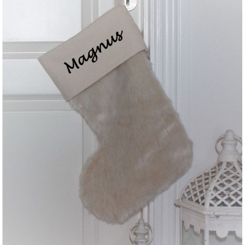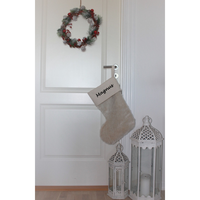 Virkelig skøn pels julestrømpe i imiteret lang pels med hør-kant.