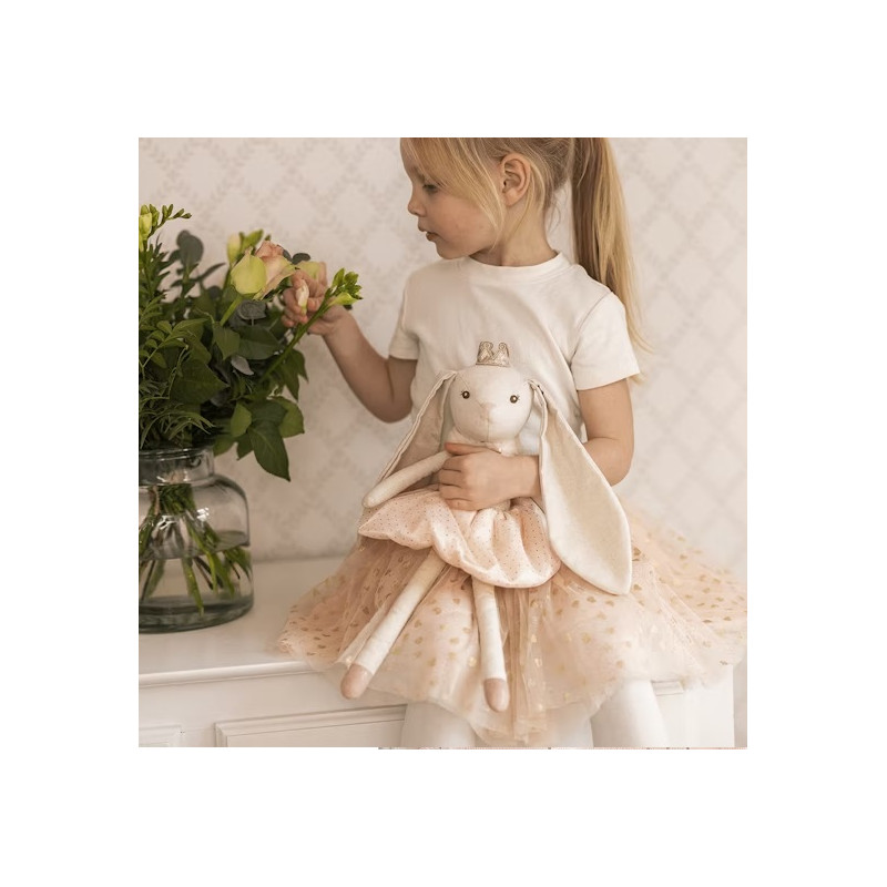 Den skønne kaninbamse måler 40cm og har fint lyserødt ballet tøj på. Bamsekaninen har en fin guld krone på hovedet.