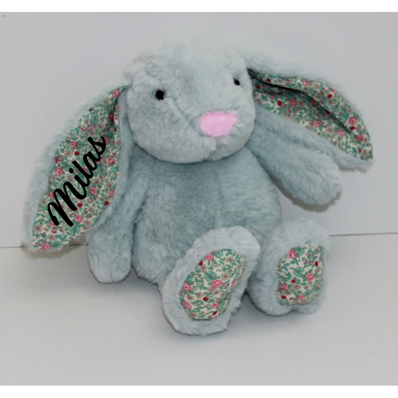Gør gaven helt unik med den lyseblå Tinka kaninbamse med blomster og navn. Denne søde bamse er 30 cm høj og lavet i blød plys med fine detaljer – lyseblå pels, blomsterstof i ørerne og under fødderne. Den er skabt til at blive elsket og krammet hver dag.