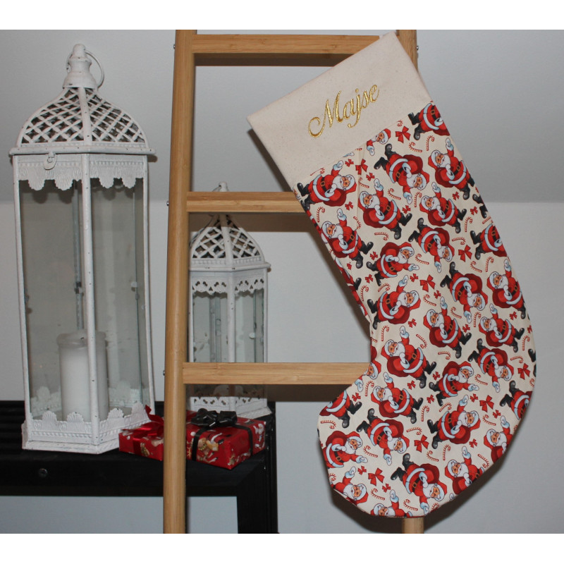 Julesokken er designet af os, og lavet så der kan komme lidt større gaver i og et fint navn broderet på. Navnet kan fylde ca. 13 cm i længden.