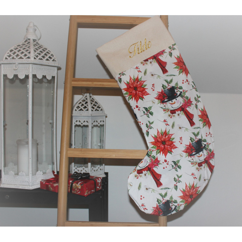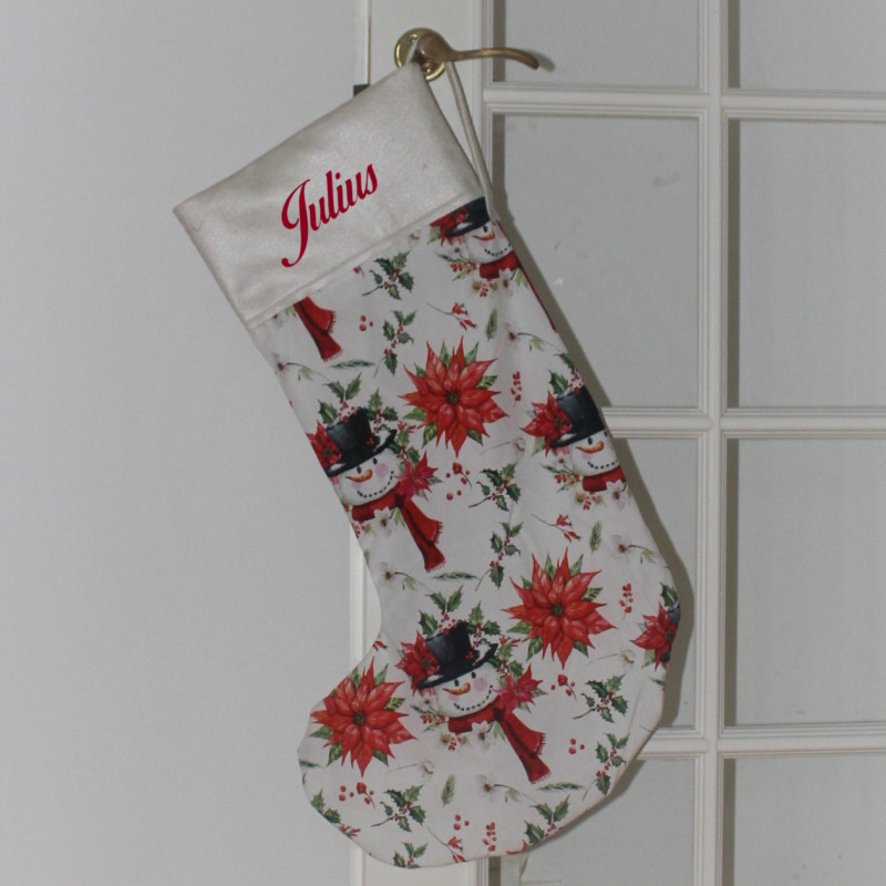 Stor julesok med snemand, julestjerner og navn på.