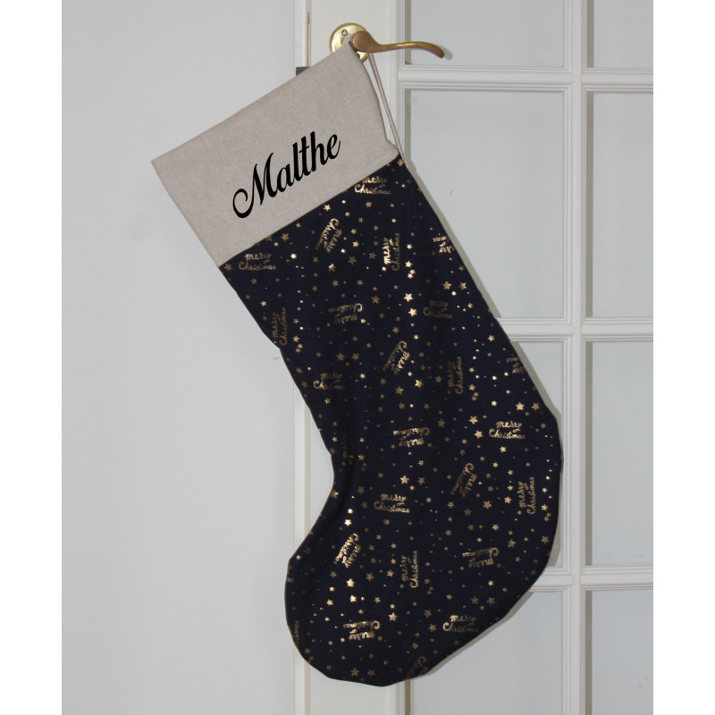 Stor mørkeblå julesok med Merry Christmas i guld og navn på.