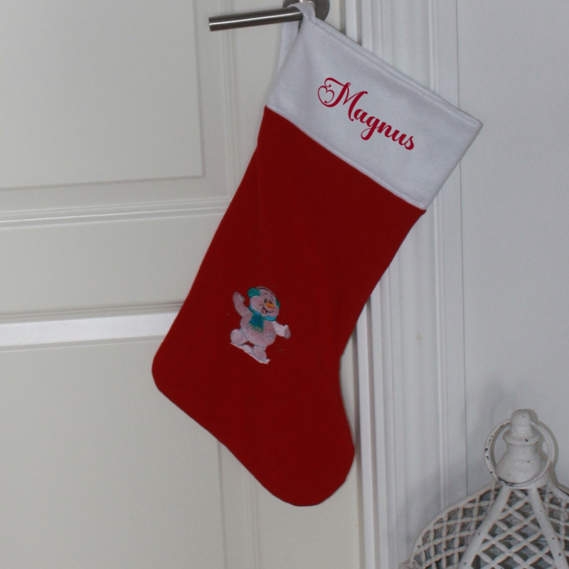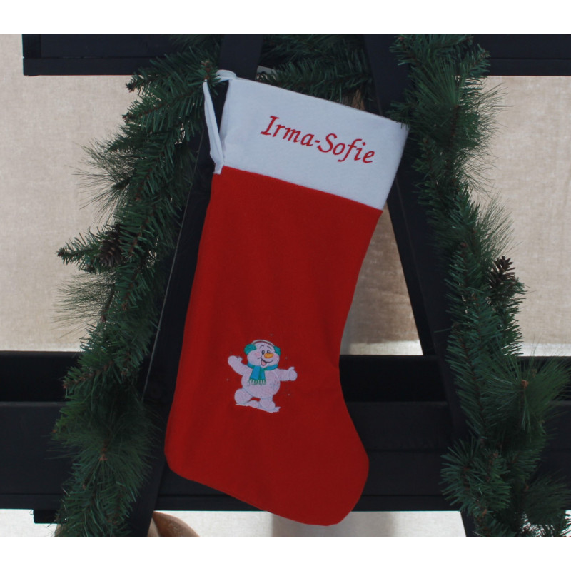 Julestrømpen er i mørkerød fleece med hvid filtkant øverst og en god hank på.