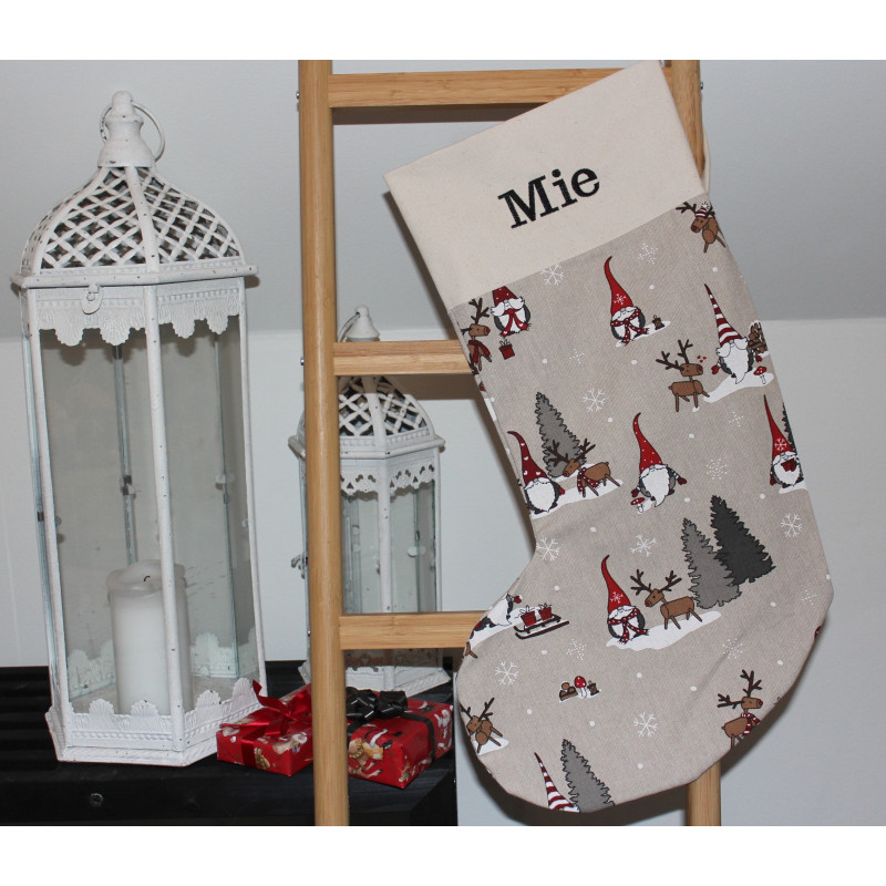 Fin stor julesok med nisser, træer, rensdyr og personligt navn på.