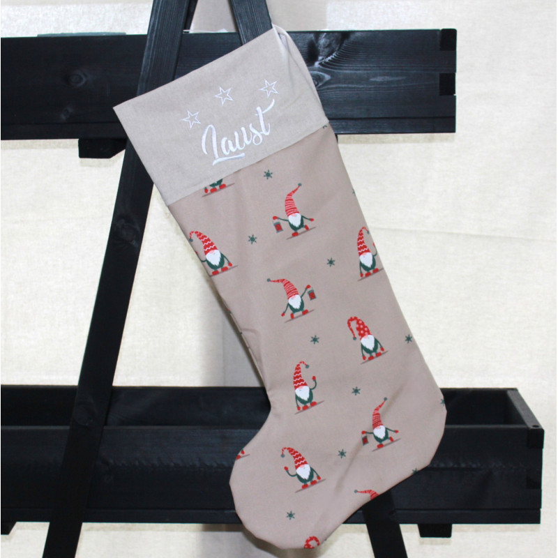 Julesokken broderes med personligt navn på det øverste stykke. Her kan der også broderes et motiv sammen med navnet. Motiv kan vælges i menuen sammen med trådfarve.