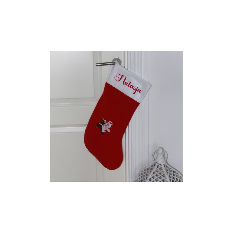 Fin rød julestrømpe i blød rød fleece og hvid filtkant.